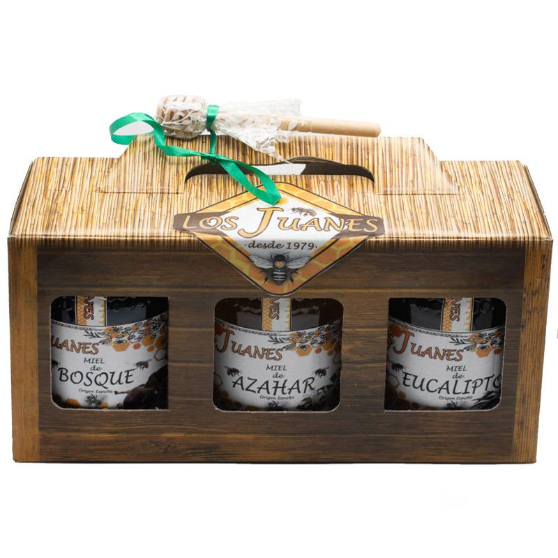Cajita con 3 botes de miel de medio kilo y palito para miel