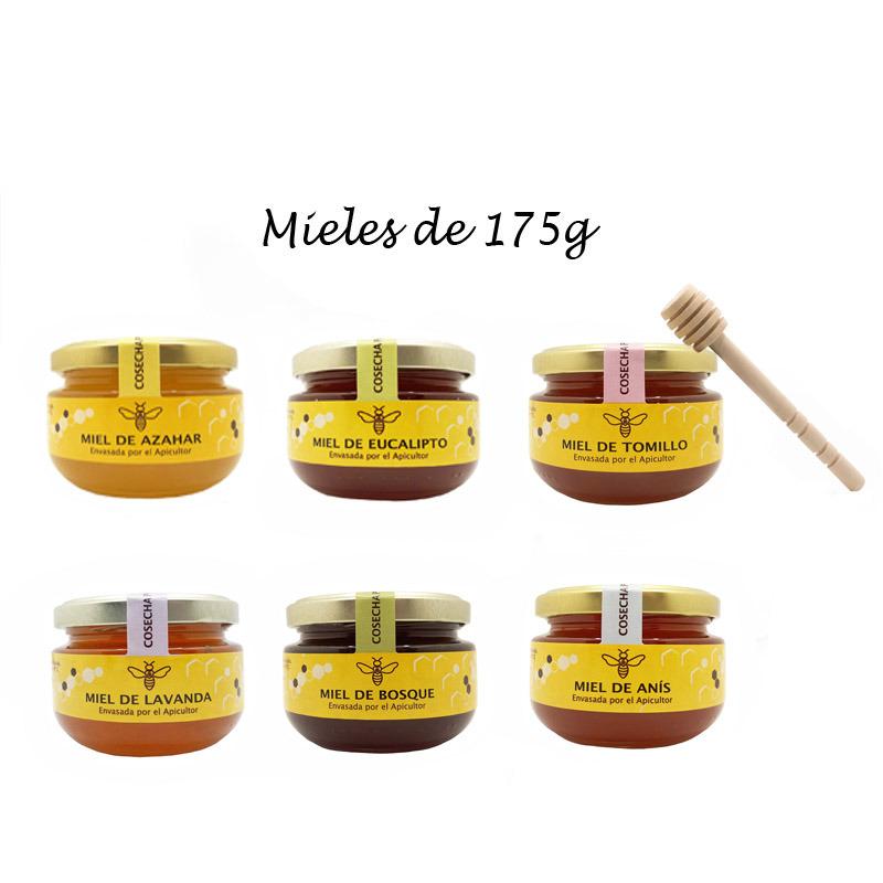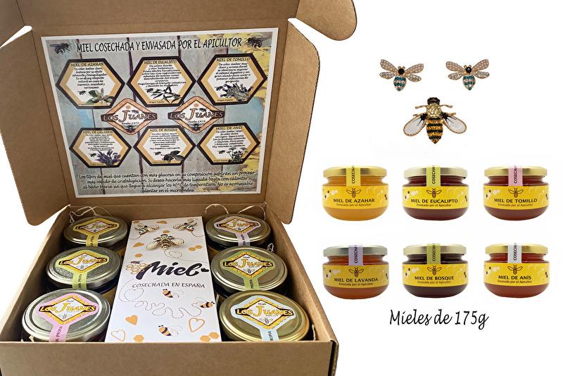 Nuestro Pack Gourmet consiste en un pack de 6 tarros de miel de 175g cada uno (miel de azahar, eucalipto, tomillo, lavanda, bosque y anís),un palito para miel y un broche y unos pendientes con forma de abeja. Todo esto en un formato perfecto para regalar.